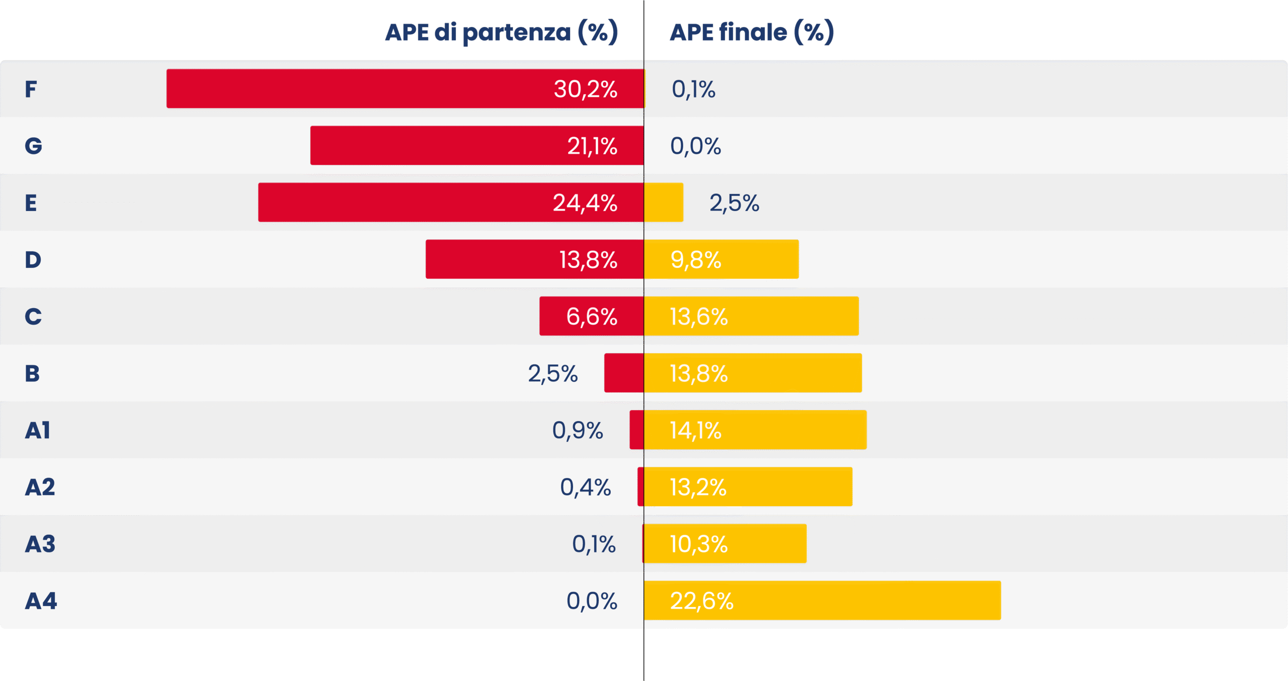 Gli interventi hanno dunque spostato in massa il patrimonio edilizio dalla parte bassa e inefficiente della scala energetica alla sua estremità più virtuosa, realizzando una transizione energetica concreta e misurabile.