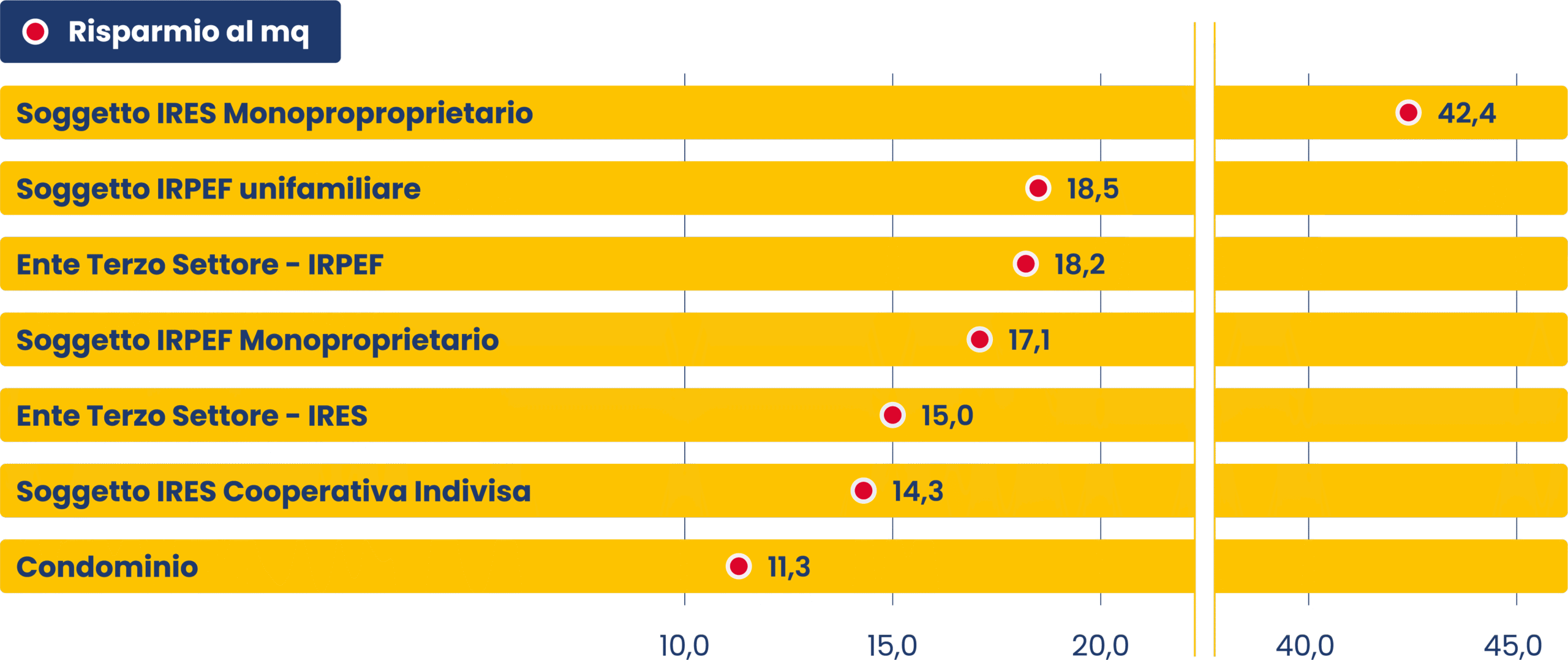 Il primato spetta agli edifici condominiali da 2 a 4 unità immobiliari riconducibili a un unico proprietario (Soggetto IRPEF Monoproprietario), che registrano un eccezionale salto medio di 5,6 classi. Subito dopo si posizionano gli edifici unifamiliari (Soggetto IRPEF Unifamiliare), con un miglioramento quasi identico, pari a 5,5 classi. A seguire si collocano gli Enti del Terzo Settore (sia IRPEF con 4,7 classi, sia IRES con 5), che mostrano comunque performance di rilievo.
