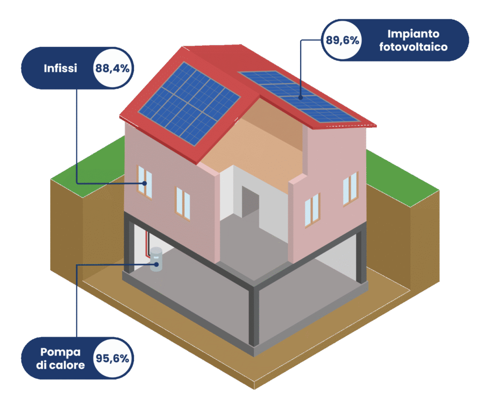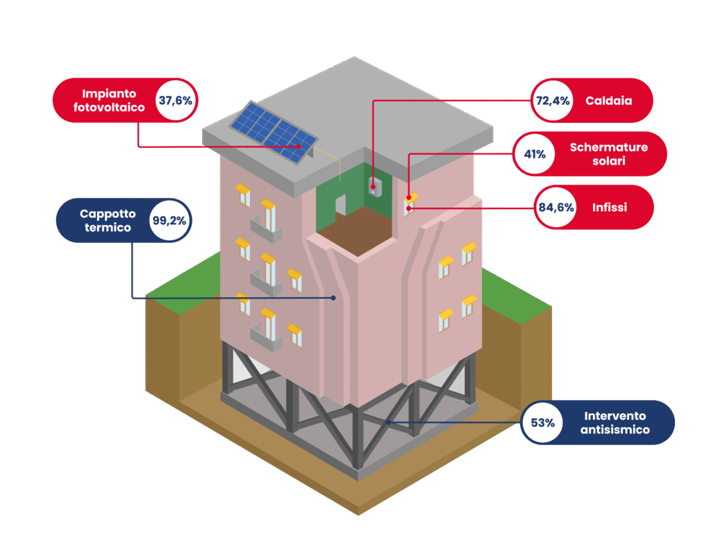 In quasi la totalità dei cantieri italiani che interessano l’intero edificio, l’intervento più richiesto è il cappotto termico (oltre il 96%), confermandone l’importanza nella riqualificazione energetica. Seguono l’inserimento di un impianto fotovoltaico con (53%) e senza accumulo (55%) e dall’intervento antisismico (48,3%).