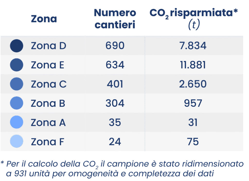Nell’analisi del risparmio di CO₂ per zona climatica[1], emerge una generale corrispondenza tra numero di cantieri e diminuzione di CO₂ (zona D: 25,16 kg/mq anno) tranne per le due zone climatiche più estreme dove il risparmio è maggiore nelle zone più fredde, dimostrando come gli interventi di efficientamento nei climi più rigidi, quindi dove il riscaldamento è più intensivo, producono il massimo beneficio ambientale (A: 4 interventi – 11,12 kg/mq anno; F: 6 – 30,31 kg/mq anno).